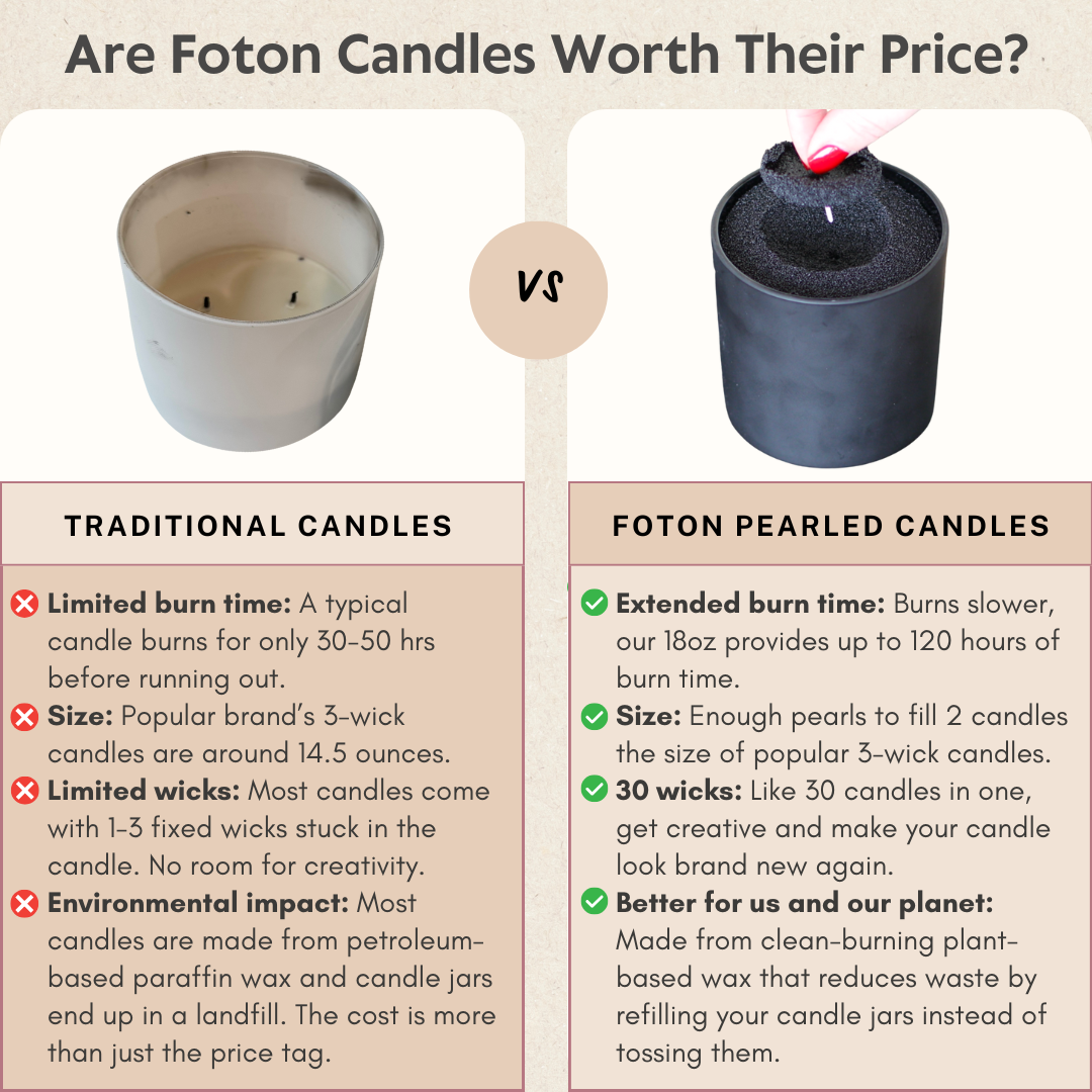 Foton’s candle pearls are made from plant-based wax (often coconut or other natural waxes), which is renewable and burns cleaner than traditional paraffin. Pearled candles are known for being more sustainable and producing minimal environmental waste.