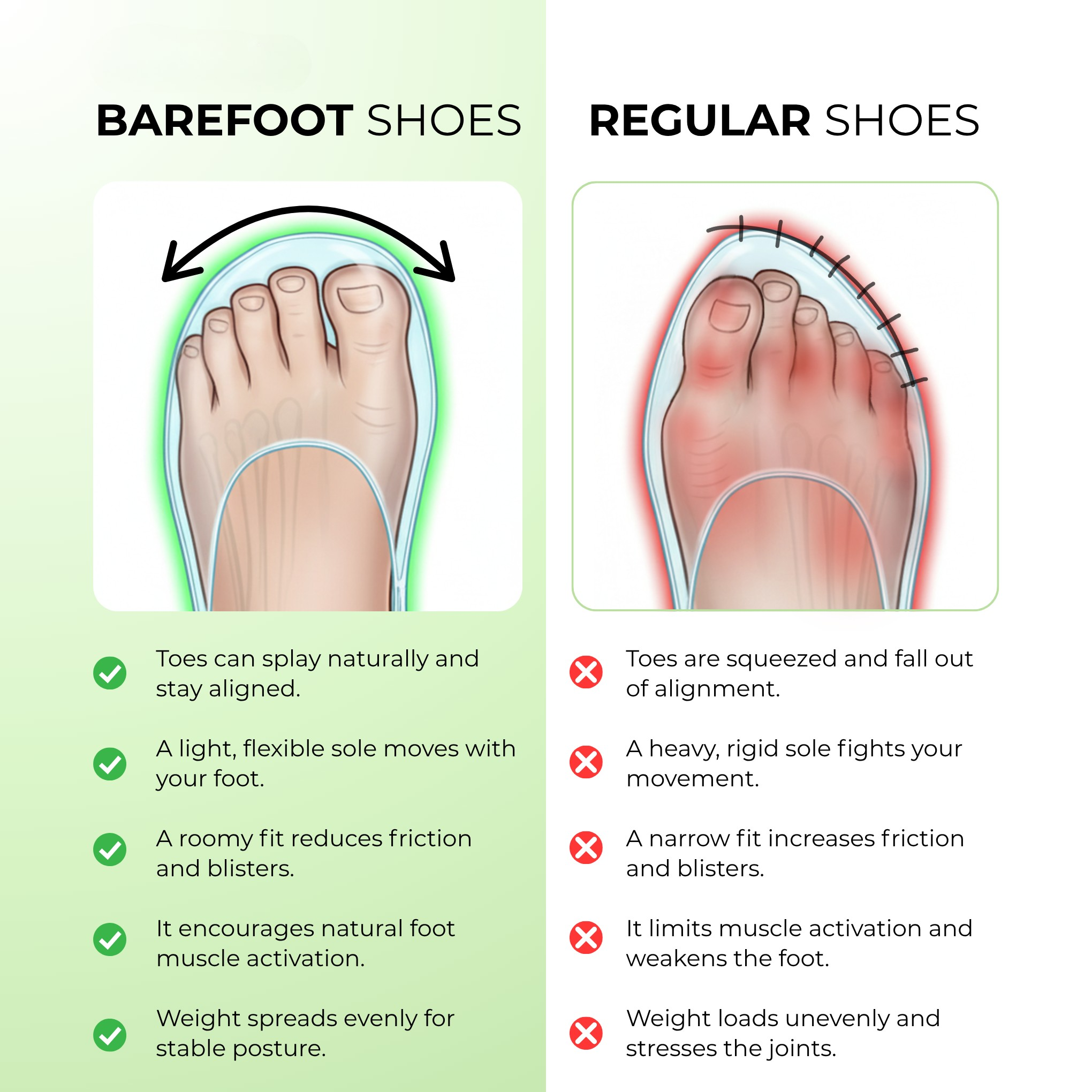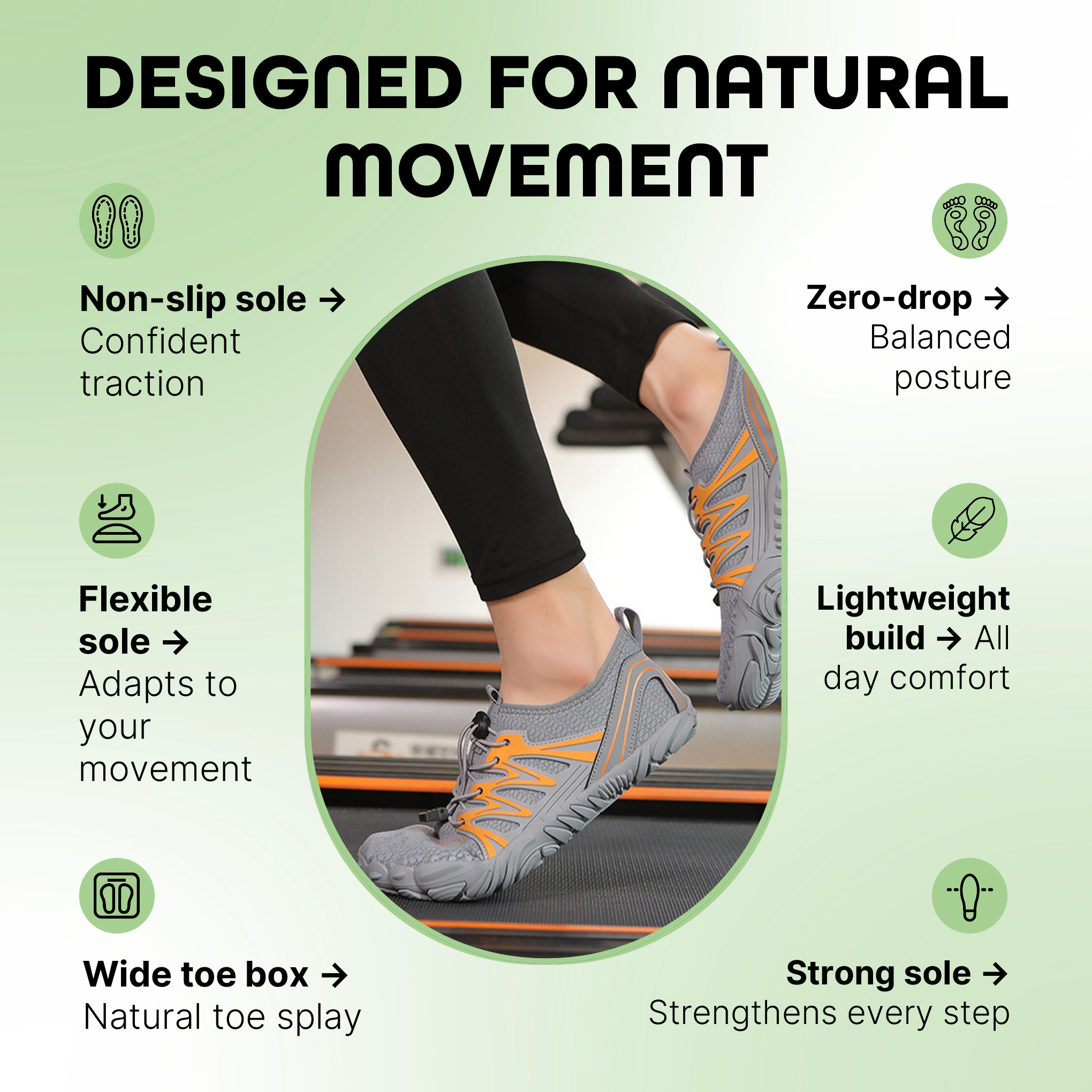 The minimalist structure of the Mova shoes encourages your foot muscles to do the work. Without excessive cushioning or arch support, your intrinsic foot muscles engage more, promoting strength and resilience.