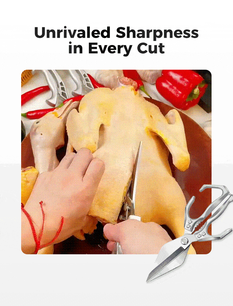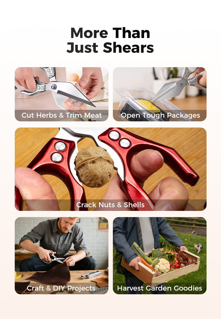 Discover the ultimate kitchen companion: Multifunctional Heavy-Duty Kitchen Shears. Built to handle everything from poultry and herbs to opening jars and cracking nuts, these shears elevate your food prep with strength, precision and versatility. Made for serious cooks who demand more than just a pair of scissors.