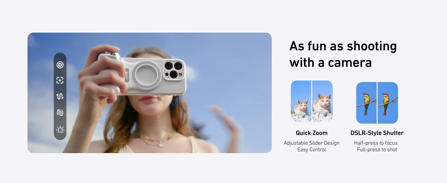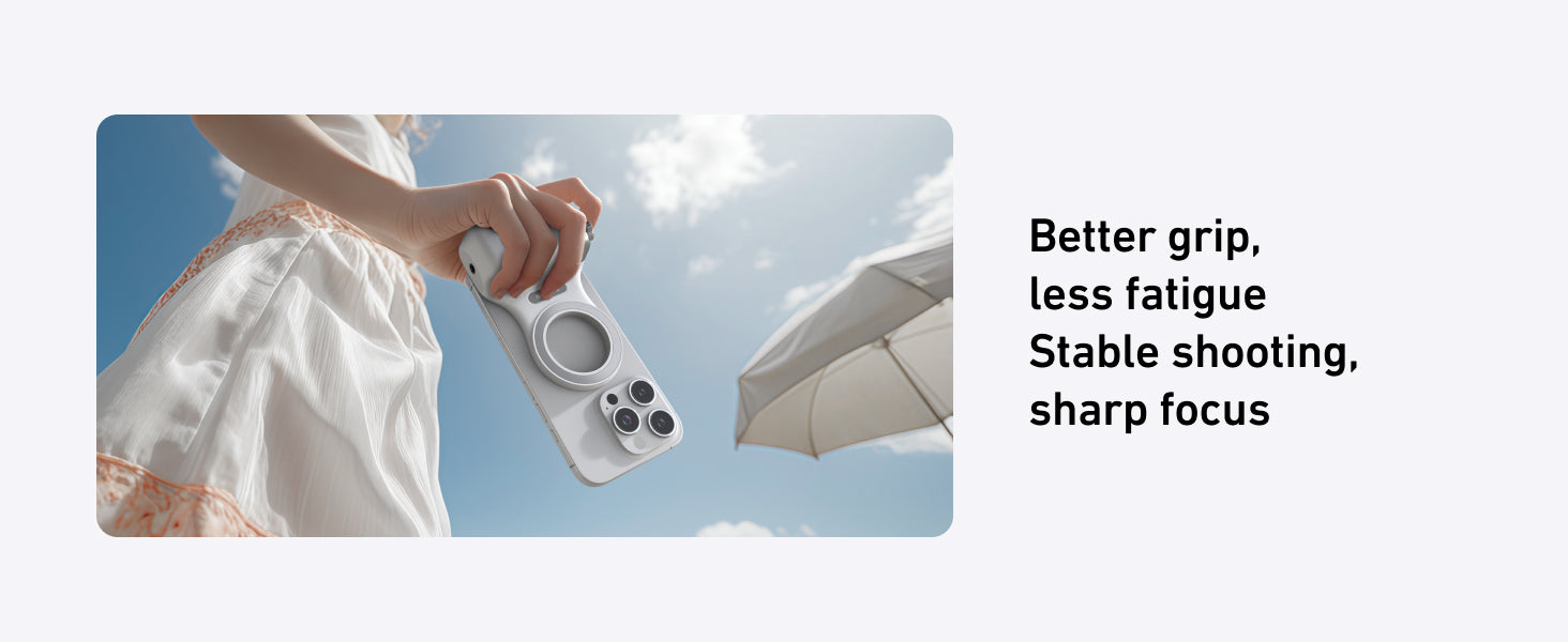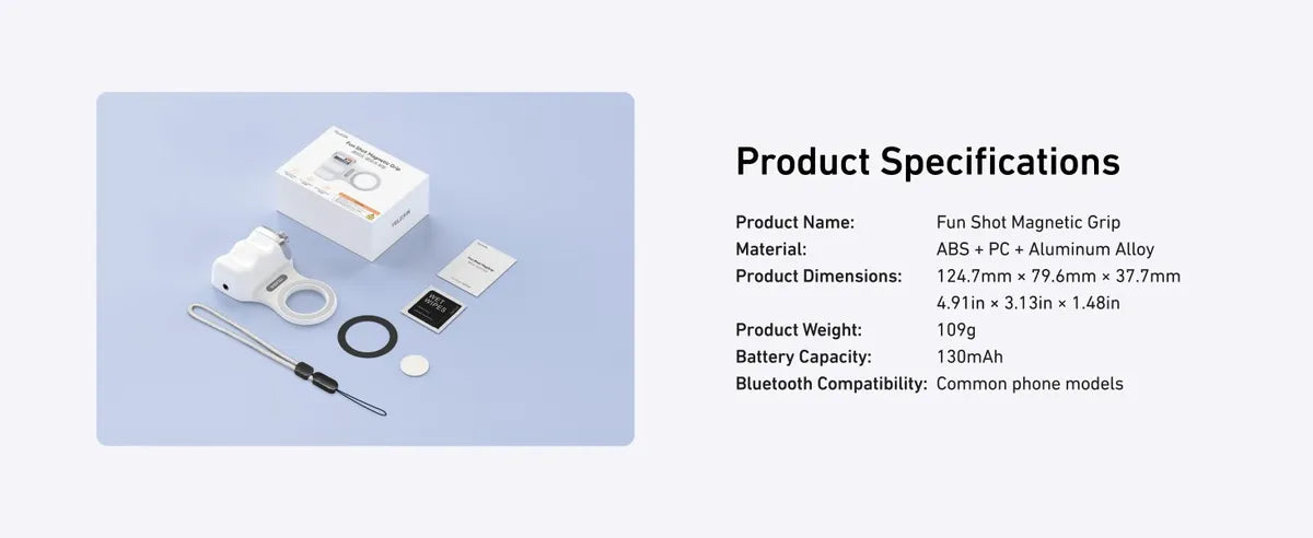 The TELESIN Fun Shot Magnetic Phone Camera Grip is the perfect accessory to level up your smartphone photography and videography. Just attach it magnetically to your phone or compatible case, connect the Bluetooth remote, and you’re ready to shoot like a pro — whether you're capturing family memories, live streams or travel vlogs.